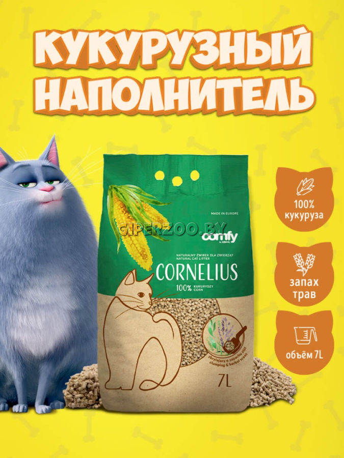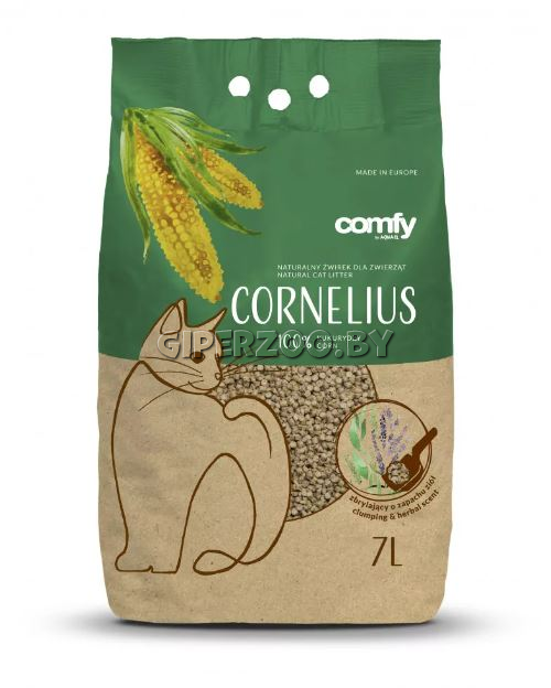 "Кукурузный наполнитель Comfy Cornelius Herbs — это наполнитель, который на 100% состоит из кукурузы. Он обогащен уникальным ароматом, который эффективно маскирует любые неприятные запахи и в то же время побуждает кошек пользоваться лотком. Во-первых, наполнитель отлично впитывает жидкость, благодаря чему лоток всегда остается свежим и чистым. Наполнитель не липнет к лапам и не пылит. Можно использовать даже кошкам с длинной шерстью. Это биоразлагаемый продукт. Cornelius Herbal - откройте для себя преимущества наполнителя для кошачьих туалетов Важнейшим преимуществом этого продукта является его впитывающая способность и эффективность. Это позволяет владельцам кошек реже покупать наполнитель. Это 100% биоразлагаемый продукт, поэтому отдельные комки можно удалить санитарными путями или поместить их в контейнер для отходов. Наполнитель отлично впитывает неприятные запахи, оставляя неповторимый травяной аромат вокруг лотка. Даже котята будут в восторге от его консистенции.