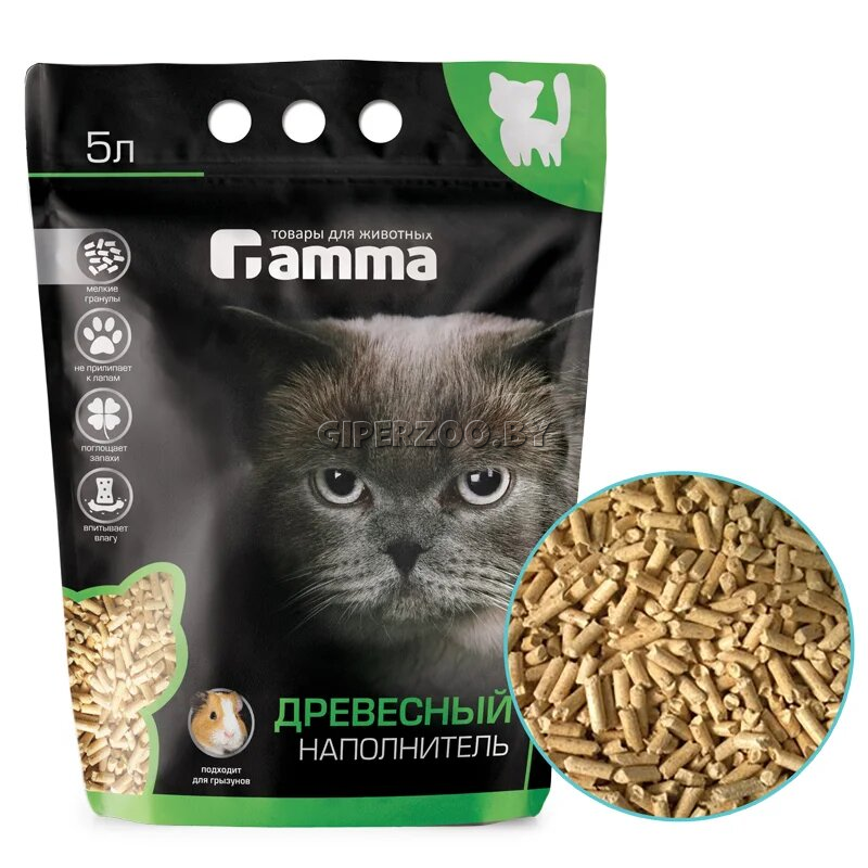 Гамма Наполнитель древесный 15 л - это впитывающий наполнитель с мелкими гранулами.