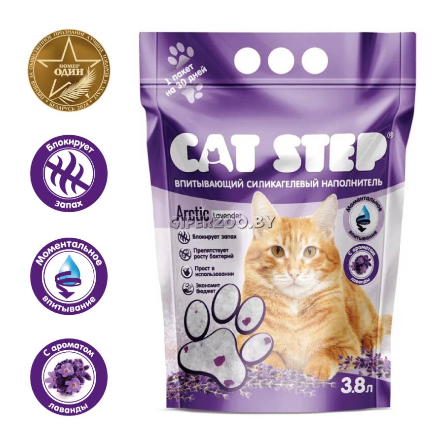 Cat Step Лаванда 3,8 л - это силикагелевый наполнитель, который моментально впитывает жидкости и уничтожает неприятные запахи. Гранулы не налипают на лапы, не пылят и не вызывают аллергии.