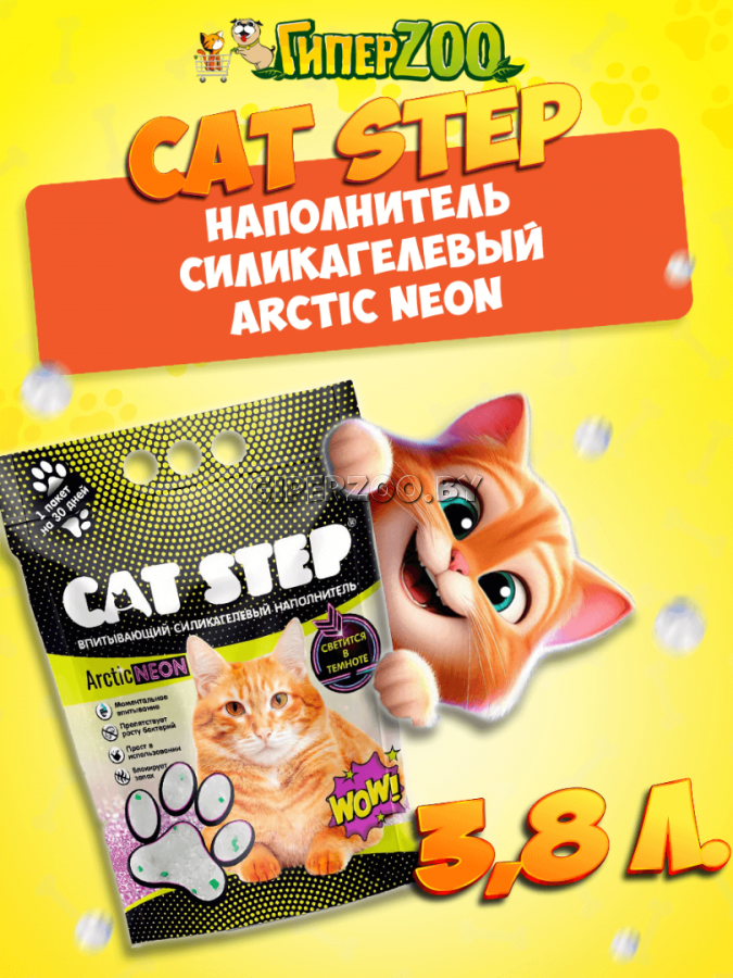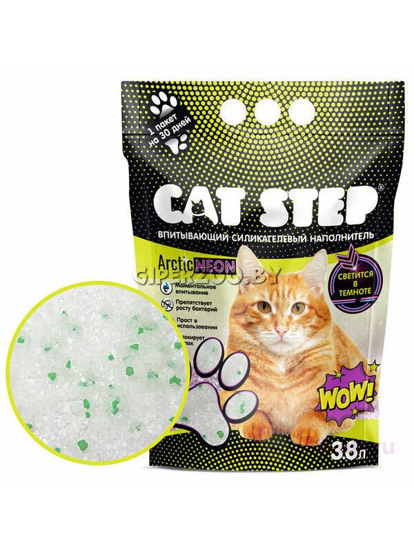 CAT STEP Arctic Neon, 3,8 л - впитывающий силикагелевый наполнитель с люминесцентными зелеными гранулами.