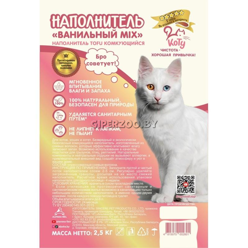 КОТУ Наполнитель TOFU Ванильный MIX, 6 л (2,5 кг) - это комкующийся соевый наполнитель для кошачьих туалетов. Благодаря волокнистой структуре, при попадании жидкости соевые гранулы образуют крепкий комок и надежно запирают запах внутри.