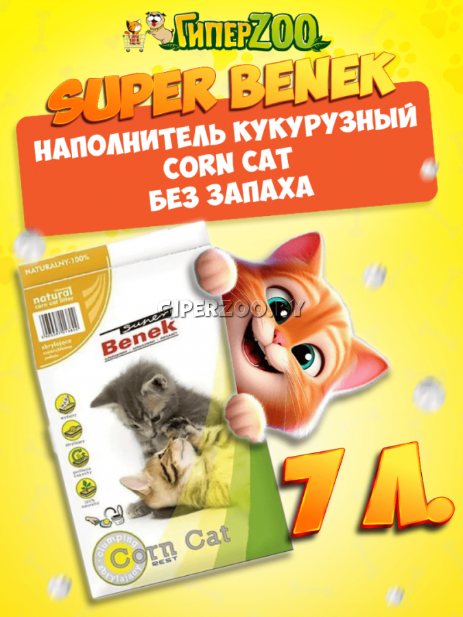 Super Benek Corn Cat Natural (Супер Бенек Корн Кэт) Наполнитель кукурузный комкующийся. Подстилка из 100% натурального возобновляемого сырья. Биоразлагаемый. Обладает натуральным тонким ароматом кукурузы. Он отличается мелкозернистостью и высокой удельной плотностью, что обеспечивает высокую производительность продукта. Соответствующий вес зерен ограничивает распространение гравия за пределы подстилки. Комки подстилки прочно скрепляются и не крошатся, когда вы вынимаете их из туалетного лотка лопаткой. Инновационная технология объединения неприятных запахов в комок гарантирует свежесть и эффективное устранение характерного запаха кошачьей мочи.