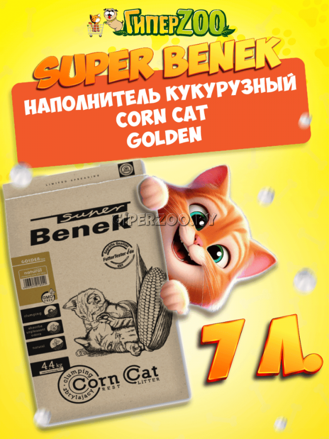 Super Benek Corn Cat Natural (Супер Бенек Корн Кэт) Наполнитель кукурузный комкующийся. Подстилка из 100% натурального возобновляемого сырья. Биоразлагаемый. Обладает натуральным тонким ароматом кукурузы. Он отличается мелкозернистостью и высокой удельной плотностью, что обеспечивает высокую производительность продукта. Соответствующий вес зерен ограничивает распространение гравия за пределы подстилки. Комки подстилки прочно скрепляются и не крошатся, когда вы вынимаете их из туалетного лотка лопаткой. Инновационная технология объединения неприятных запахов в комок гарантирует свежесть и эффективное устранение характерного запаха кошачьей мочи.