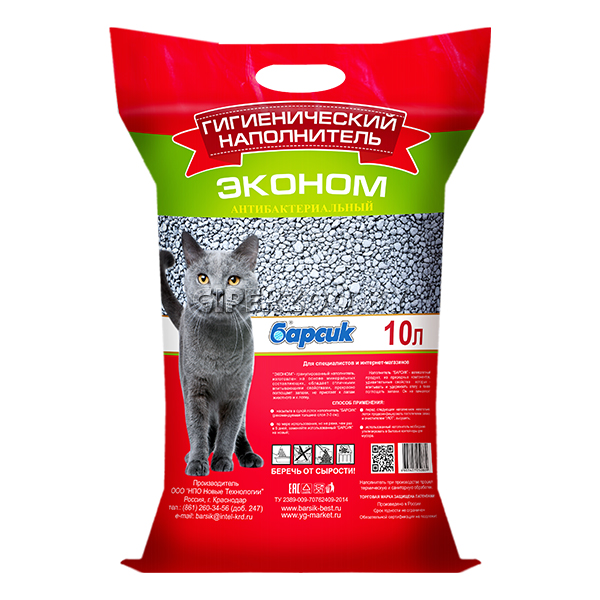 Основные свойства наполнителя Барсик «Эконом»: изготовлен из 100% натуральных минеральных компонентов, Обладает бактерицидными свойствами, отлично впитывает влагу, защищает от запаха, гранулы не прилипают к шерсти и лапам, не токсичен, не вызывает аллергии, экологически чистый продукт.