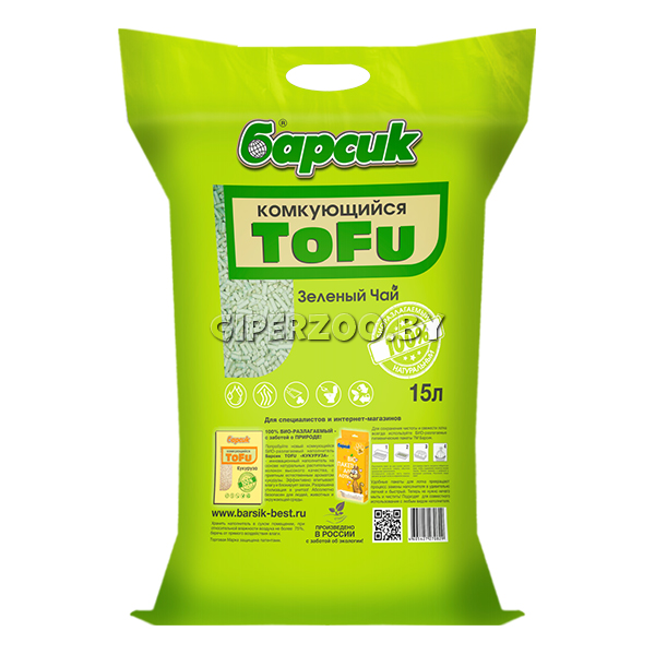 Барсик Наполнитель TOFU Зелёный Чай 15 л - высококачественный натуральный комкующийся наполнитель для кошачьего туалета на основе растительных волокон, с легким приятным ароматом зеленого чая.