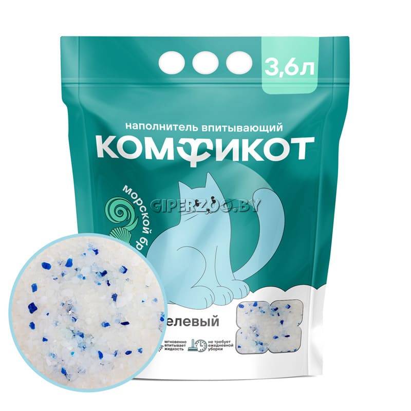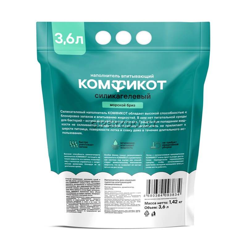 Комфикот Наполнитель силикагелевый впитывающий (морской бриз), 3,6 л – надёжное решение для поддержания чистоты и свежести в кошачьем лотке. Благодаря уникальной структуре гранул, наполнитель эффективно поглощает жидкость и блокирует неприятные запахи на длительное время.