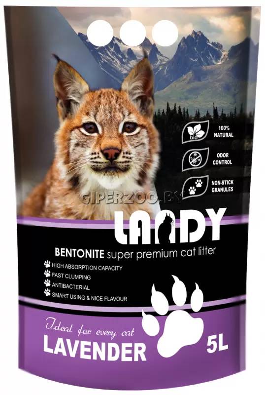 Landy Наполнитель комкующийся бентонитовый (лаванда), 5 л – это высококачественный бентонитовый наполнитель для кошачьего туалета с ароматом лаванды. Наполнитель производится из натурального белого бентонита (природный глинистый минерал), активированного карбонатом натрия (Na2CO3), с применением двойного просеивания для максимального устранения пыли.