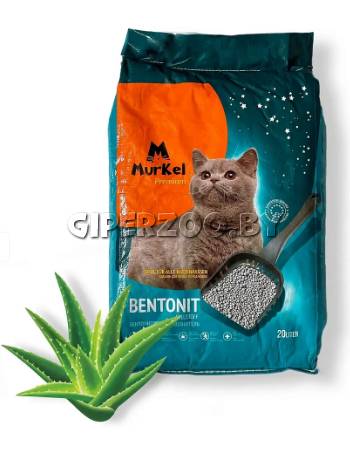 Murkel Наполнитель бентонитовый (Алоэ вера), 20 л (16 кг) – комкующийся наполнитель для туалета кошек в виде формованных шариков 0,8-3,5 мм, изготовленных из бентонита природного вулканического глинистого минерала, обладающего свойством поглощения запахов и разбухания при контакте с жидкостью до объёма в 14-16 раз превышающий его первоначальный.