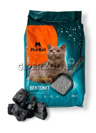 Murkel Наполнитель бентонитовый (Уголь), 20 л (16 кг) – комкующийся наполнитель для туалета кошек в виде формованных шариков 0,8-3,5 мм, изготовленных из бентонита природного вулканического глинистого минерала, обладающего свойством поглощения запахов и разбухания при контакте с жидкостью до объёма в 14-16 раз превышающий его первоначальный.