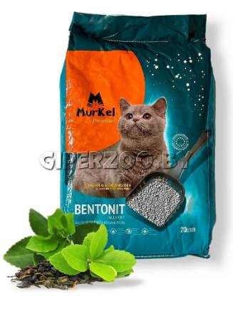 Murkel Наполнитель бентонитовый (Зеленый чай), 20 л (16 кг) – комкующийся наполнитель для туалета кошек в виде формованных шариков 0,8-3,5 мм, изготовленных из бентонита природного вулканического глинистого минерала, обладающего свойством поглощения запахов и разбухания при контакте с жидкостью до объёма в 14-16 раз превышающий его первоначальный.
