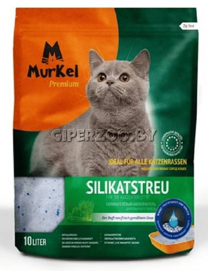 Murkel Наполнитель силикагелевый (Скошенная трава), 10 л (4,5 кг) изготавливается из гидратированной двуокиси кремния. Выглядит как стеклянные кристаллы, твёрдые, неправильной формы, а на ощупь напоминают пластик. Благодаря специфической структуре, поглощают мочу и накапливают её внутри гранул.
