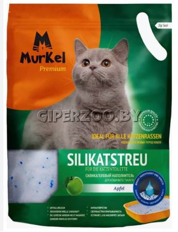 Murkel Наполнитель силикагелевый (Яблоко), 22 л (10 кг) изготавливается из гидратированной двуокиси кремния. Выглядит как стеклянные кристаллы, твёрдые, неправильной формы, а на ощупь напоминают пластик. Благодаря специфической структуре, поглощают мочу и накапливают её внутри гранул.