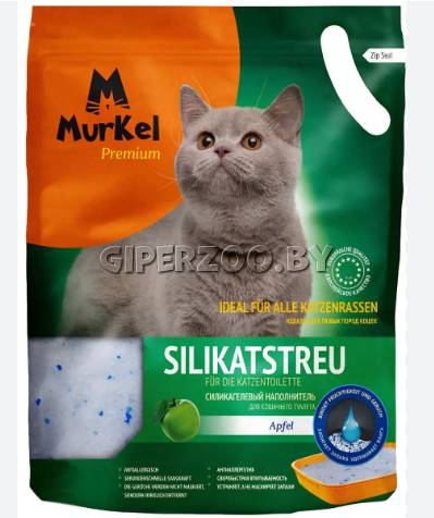 Murkel Наполнитель силикагелевый (Яблоко), 4 л (1,8 кг) изготавливается из гидратированной двуокиси кремния. Выглядит как стеклянные кристаллы, твёрдые, неправильной формы, а на ощупь напоминают пластик. Благодаря специфической структуре, поглощают мочу и накапливают её внутри гранул.
