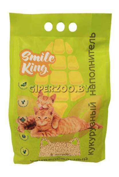 Smile King Универсальный кукурузный наполнитель – универсальный кукурузный наполнитель гипоаллергенный, не токсичен, безвреден для окружающей среды и животных. Мгновенно впитывает влагу и поглощает неприятный запах мочи животного. Гранулы не прилипают к шерсти и лапам питомца. В процессе использования не требуется полная замена наполнителя, утилизируются только комочки, наполнитель остается чистым и свежим.