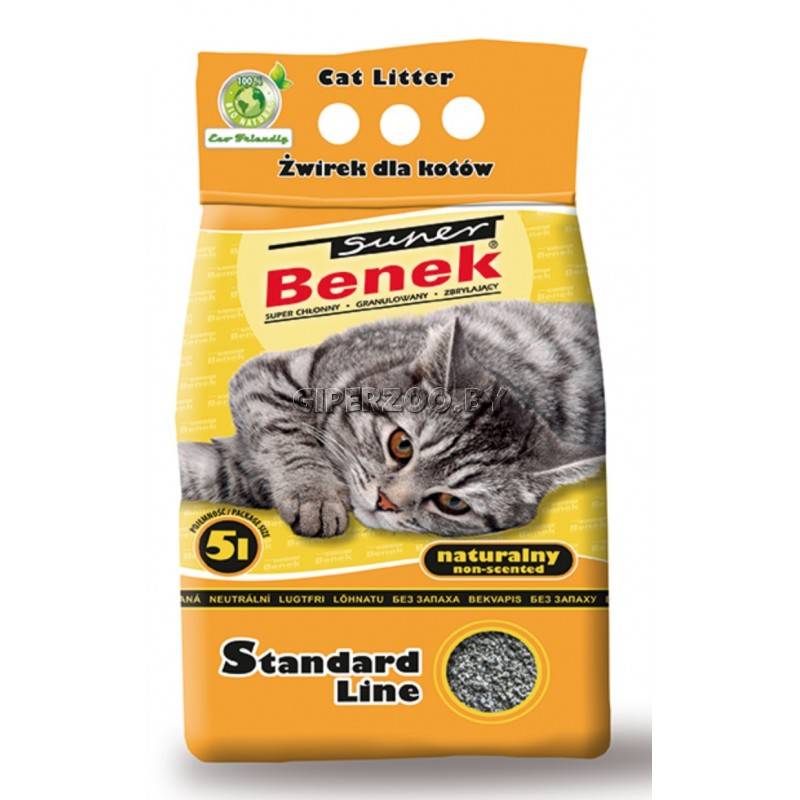 Super Benek NATURALNY это самый популярный гигиенический наполнитель предназначен для кошек, а также для питомцев покрупнее (кролик, морская свинка). Наполнитель обладает природным запахом земли, что особенно привлекает кошек. Очень пористый гранулат, беспыльный, комкается, образуя регулярные комки. Впитывает жидкость и неприятные запахи, устраняет грибок и бактерии. Гигиеничный наполнитель для домашних животных изготовлен из бентонитовых глин. Благодаря использованной технологии производства получены регулярные гранулы наполнителя размером 2-5 мм. Более эффективен, чем другие зернистые минеральные наполнители, комкается и одновременно разбухает, что увеличивает его эффективность. Очень удачно впитывает жидкости и неприятные запахи. Сухой, лёгкий, тёплый - даёт ощущение, как будто его подогревали, гарантируя комфорт для владельца и питомца.
