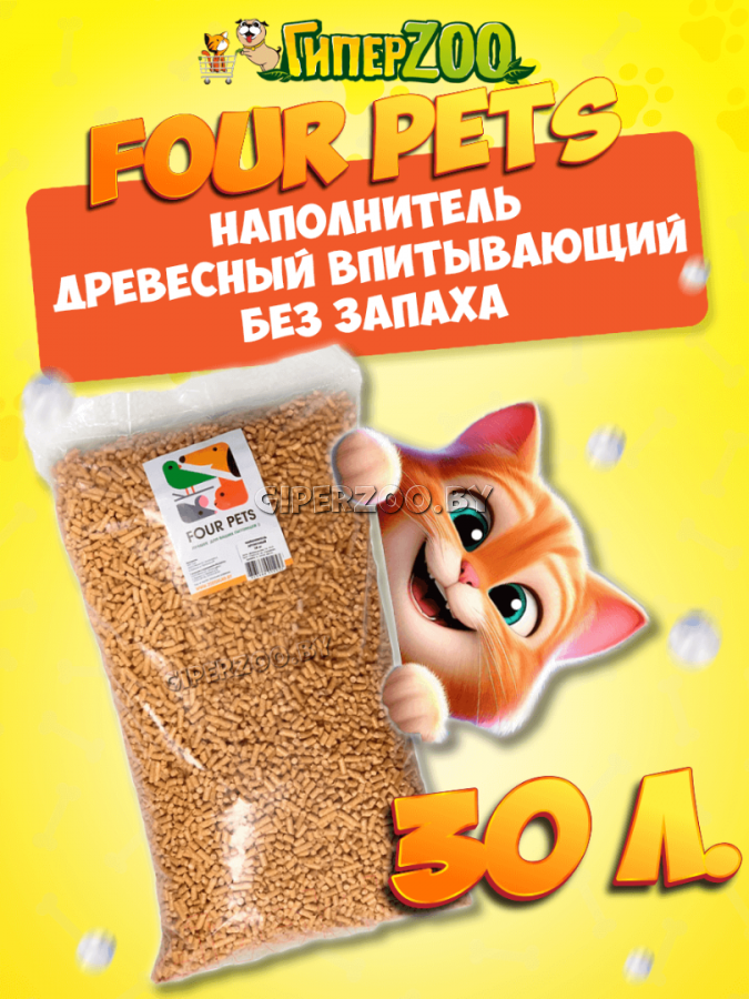 FOUR PETS, 30 л - древесный наполнитель для туалета впитывающий.