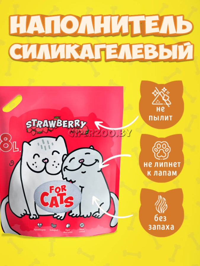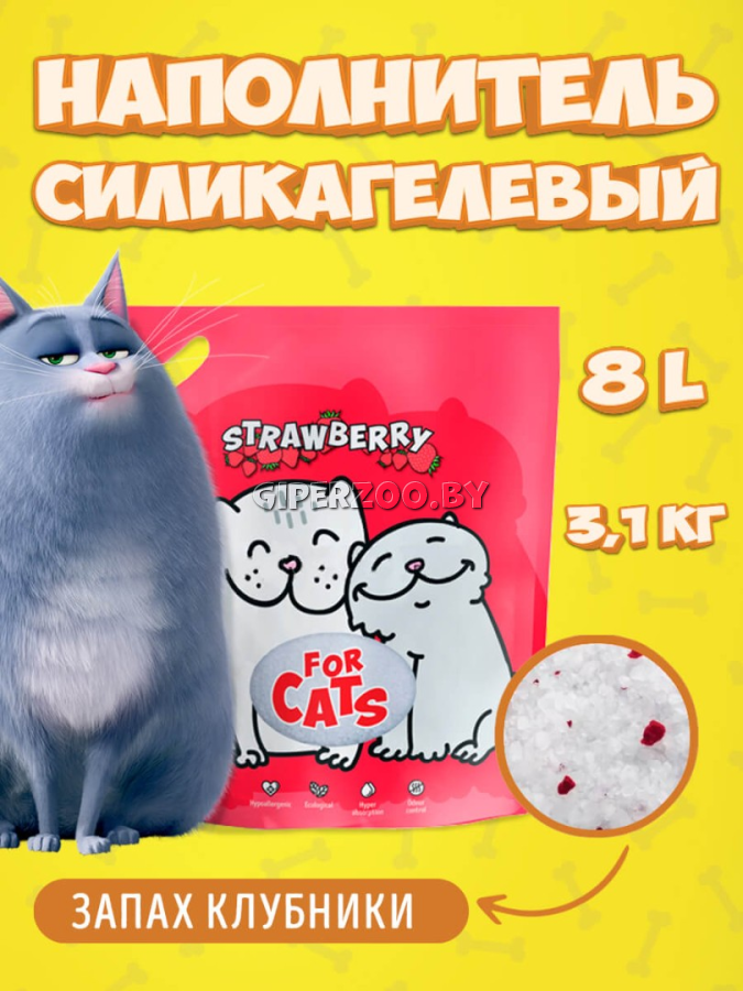Силикагелевый наполнитель для кота FOR CATS c ароматом клубники, 8 л – наполнитель для туалета силикагелевый впитывающий экологически чистый с разнокалиберной гранулой.