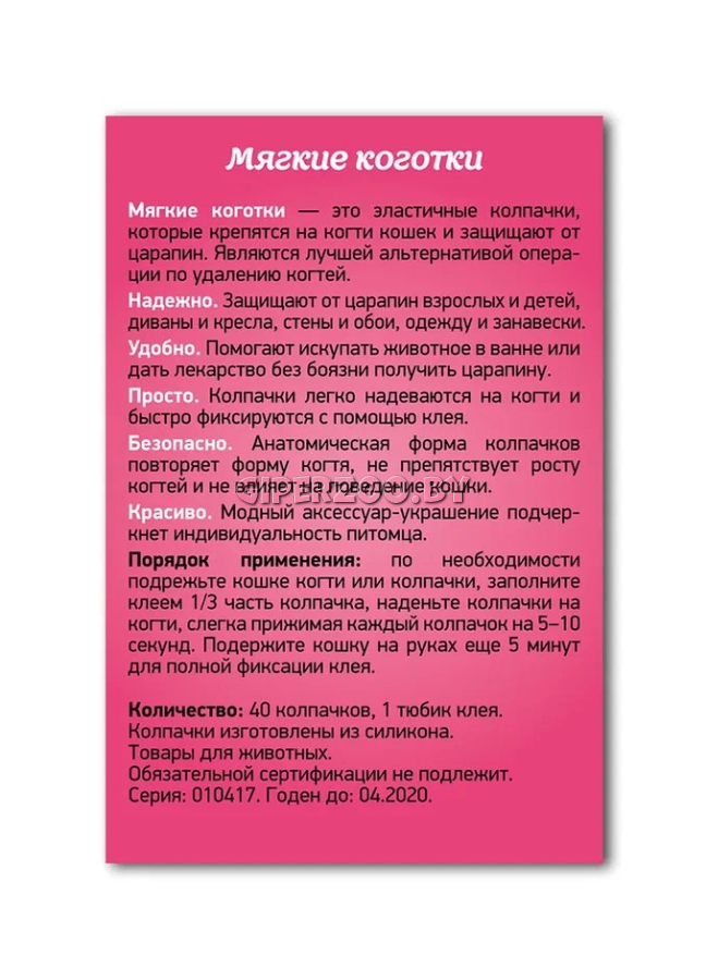 Мягкие коготки — это эластичные колпачки, которые крепятся на когти кошек и защищают от царапин. Являются лучшей альтернативой операции по удалению когтей. Надежно. Защищают от царапин взрослых и детей, диваны и кресла, стены и обои, одежду и занавески. Удобно. Помогают искупать животное в ванне или дать лекарство без боязни получить царапину. Просто. Колпачки легко надеваются на когти и быстро фиксируются с помощью клея. Безопасно. Анатомическая форма колпачков повторяет форму когтя, не препятствует росту когтей и не влияет на поведение кошки. Красиво. Модный аксессуар-украшение подчеркнет индивидуальность питомца.