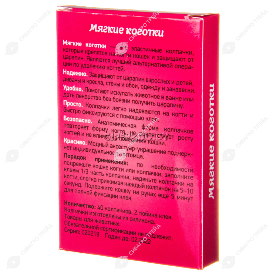 Порядок применения: по необходимости подрежьте кошке когти или колпачки, заполните клеем 1/3 часть колпачка, наденьте колпачки на когти, слегка прижимая каждый колпачок на 5–10 секунд. Подержите кошку на руках еще 5 минут для полной фиксации клея. Количество: 40 колпачков, 1 тюбик клея. Колпачки изготовлены из силикона.