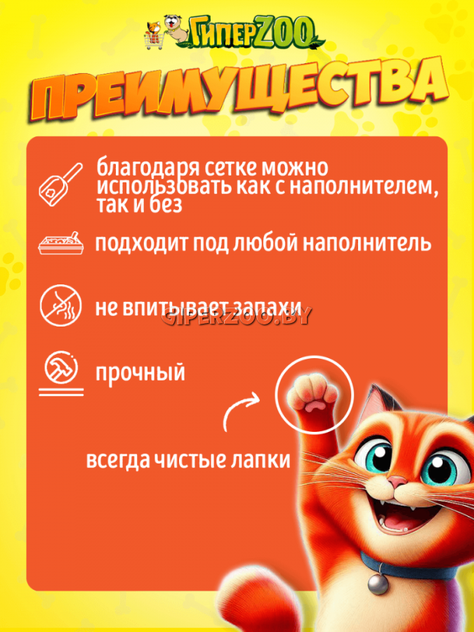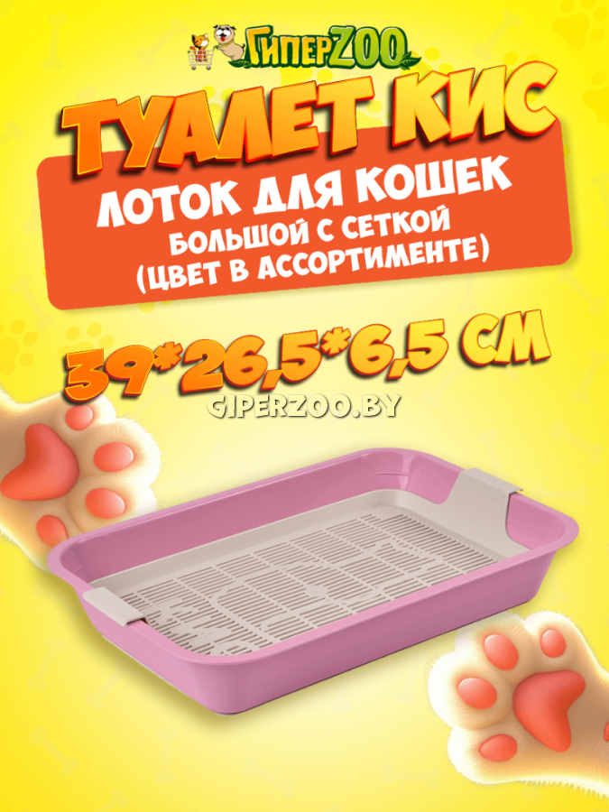 Туалет «Кис» большой имеет снимающуюся сетку, которая предотвращает высыпание наполнителя за пределы лотка. Размер лотка составляет 39×26,5×6,5 см, что отлично подойдет для кошек среднего размера.Туалеты с сеткой можно использовать без наполнителя.