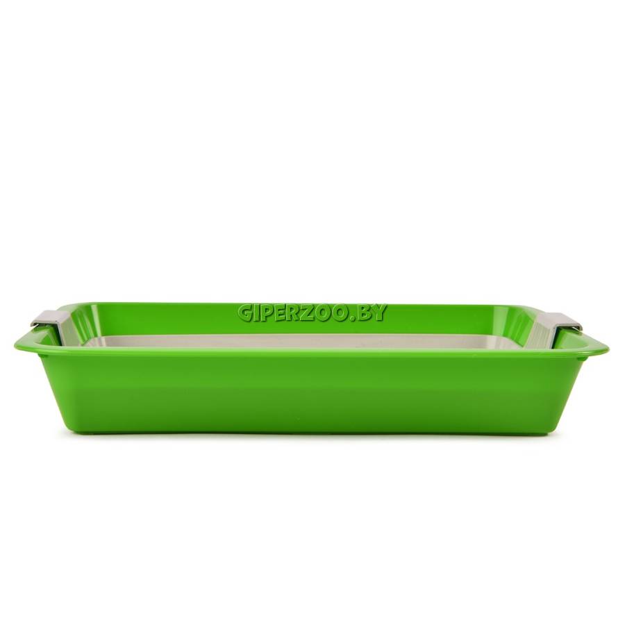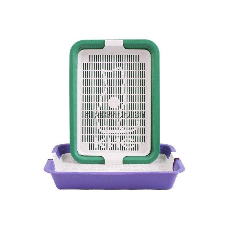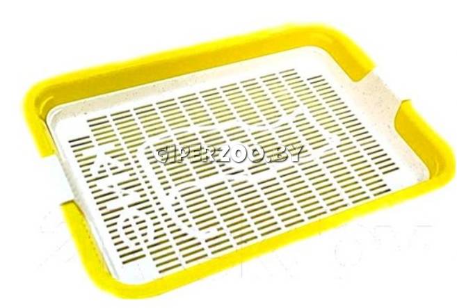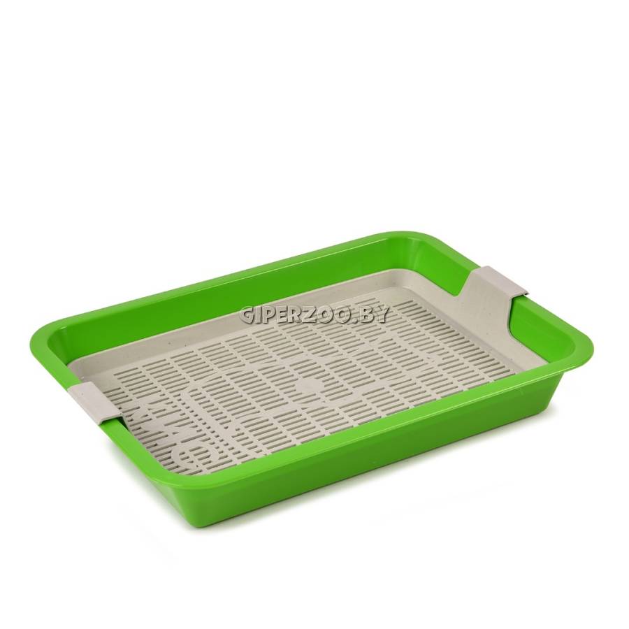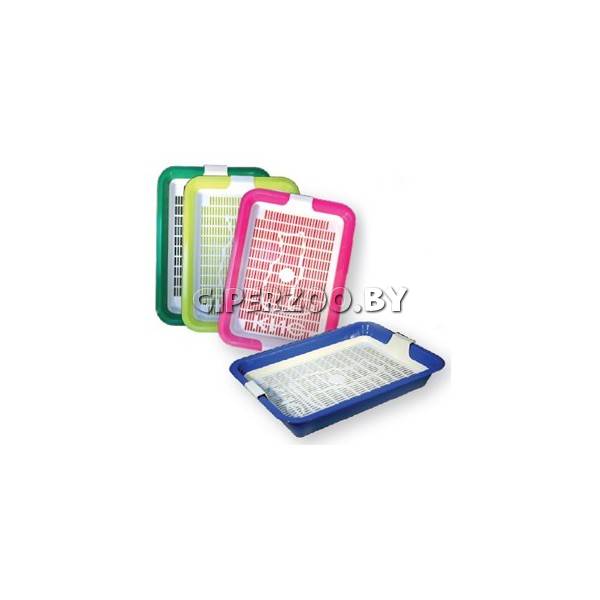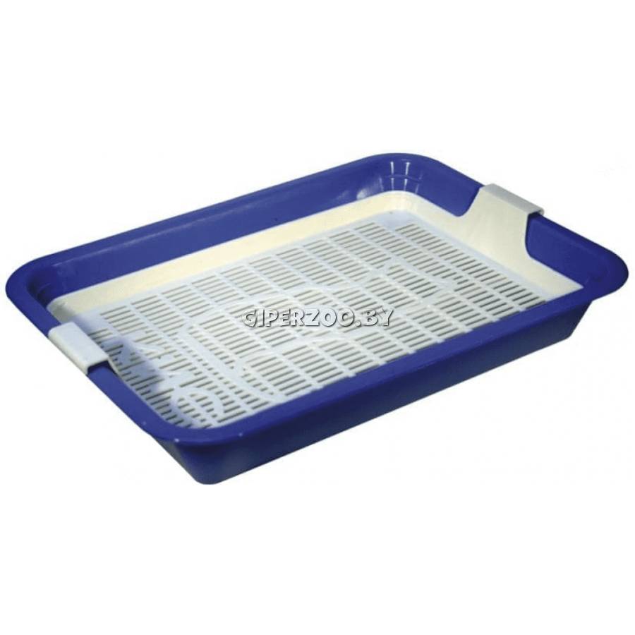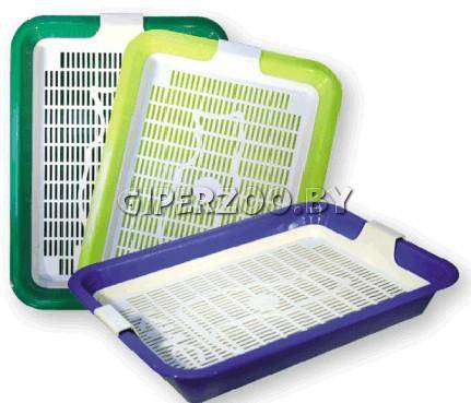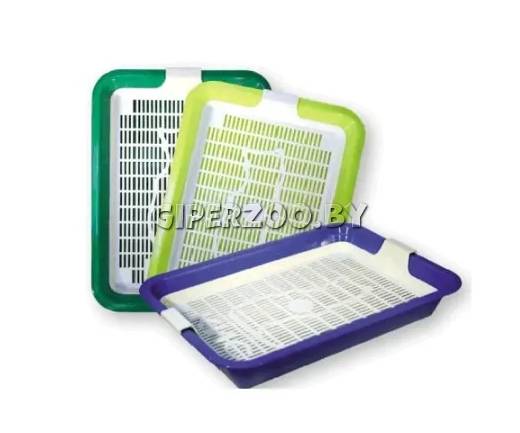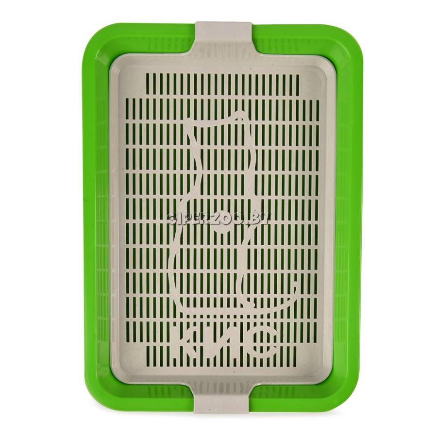 Удобный туалет прямоугольной формы для кошек, выполненный из качественного нетоксичного пластика. У него есть небольшие бортики и съемная сетка с отверстиями.