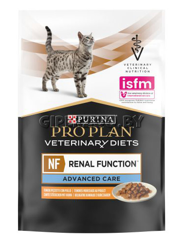 Pro Plan VETERINARY DIETS NF Advanced care(Ренал Адванс Поздняя стадия), влажный корм для кошек (курица), 85 гр - это специальная ветеринарная диета, назначающаяся при хронической почечной недостаточности и ее осложнениях. Подходит для взрослых и стареющих кошек.