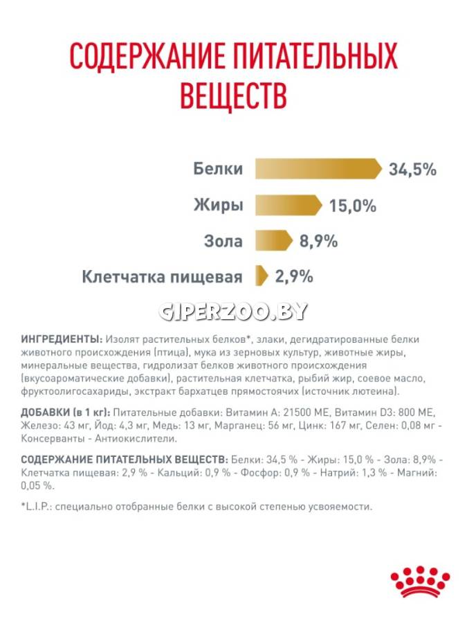 рис, изолят растительных белков*, дегидратированные белки животного происхождения (птица), пшеница, животные жиры, гидролизат белков животного происхождения (вкусоароматические добавки), растительная клетчатка, минеральные вещества, мука из зерновых культур, рыбий жир, соевое масло, фруктоолигосахариды, гидролизат из панциря ракообразных (источник глюкозамина), экстракт бархатцев прямостоячих (источник лютеина).