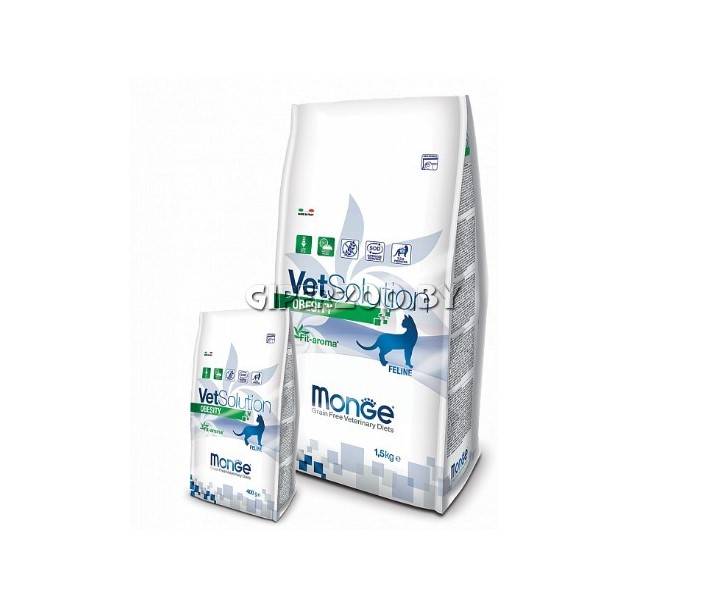 Monge VetSolution Obesity Cat — полноценный диетический корм для кошек, разработанный для снижения избыточной массы тела. Содержит концентрат сока дыни для нейтрализации свободных радикалов, семена подорожника для замедления опорожнения желудка и вызывания чувства сытости, а также ксилоолигосахариды (XOS) для сохранения микробиоты кишечника. Препарат характеризуется низкой энергетической мощностью.