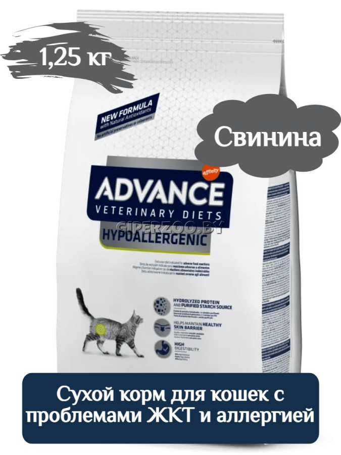 Advance VetDiets Cat Hypoallergenic – гипоаллергенный полнорационный диетический корм для взрослых кошек, созданный для снижения непереносимости ингредиентов и питательных веществ и содержащий гидролизованные источники белка и выбранные источники углеводов.