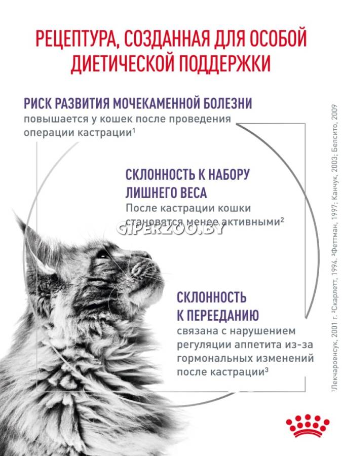 У стерилизованной кошки по сравнению с нестерилизованной в 7 раз повышается риск образования оксалатов кальция и в 3,5 раза - образования струвитов. В первые 48 часов после кастрации/стерилизации количество потребляемого корма у кошек начинает увеличиваться, что может со временем привести к ожирению.