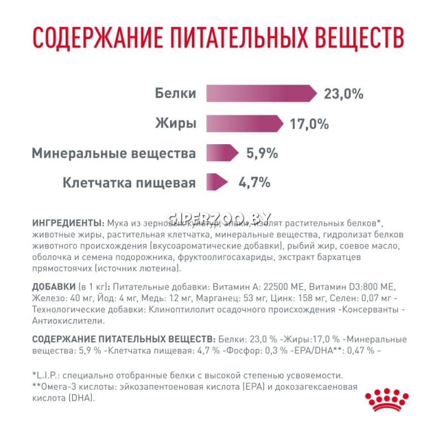 мука из зерновых культур,злаки,изолят растительных белков*, животные жиры, растительная клетчатка,минеральные вещества, гидролизат белков животного происхождения (вкусоароматические добавки), рыбий жир, соевое масло, оболочка и семена подорожника, фруктоолигосахариды, экстракт бархатцев прямостоячих (источник лютеина).