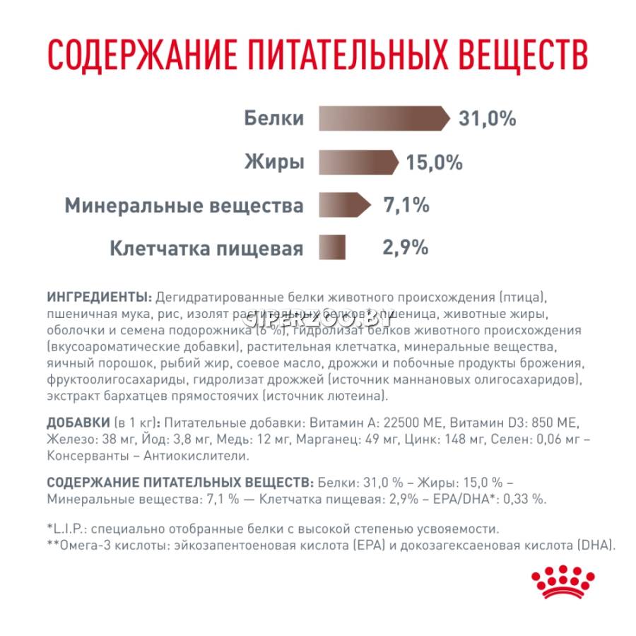 дегидратированные белки животного происхождения (птица), пшеничная мука, рис, изолят растительных белков*, пшеница, животные жиры, оболочки и семена подорожника (6 %), гидролизат белков животного происхождения (вкусоароматические добавки), растительная клетчатка, минеральные вещества, яичный порошок, рыбий жир, соевое масло, дрожжи и побочные продукты брожения, фруктоолигосахариды, гидролизат дрожжей (источник мaннановых олигосахаридов), экстракт бархатцев прямостоячих (источник лютеина).