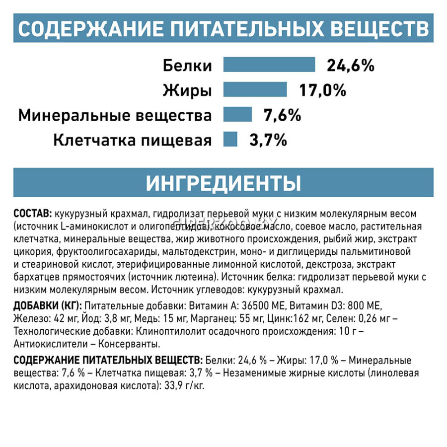 кукурузный крахмал, гидролизат перьевой муки с низким молекулярным весом (источник L-аминокислот и олигопептидов), кокосовое масло, соевое масло, растительная клетчатка, минеральные вещества, жир животного происхождения, рыбий жир, экстракт цикория, фруктоолигосахариды, мальтодекстрин, моно- и диглицериды пальмитиновой и стеариновой кислот, этерифицированные лимонной кислотой, декстроза, экстракт бархатцев прямостоячих (источник лютеина). Источник белка: гидролизат перьевой муки с низким молекулярным весом. Источник углеводов: кукурузный крахмал.