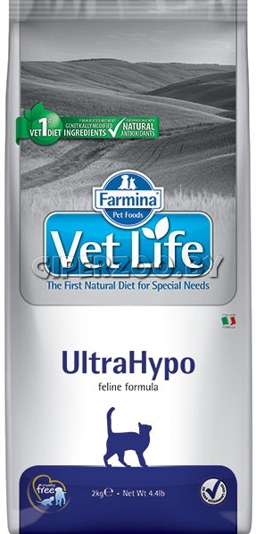 Farmina Vet Life UltraHypo Cat, 400 гр – гипоаллергенный корм для кошек. Диетическое питание для кошек при неблагоприятных реакциях на пищу, пищевой аллергии или непереносимости. Может быть использован в качестве диагностического теста (исключающая диета); Рекомендован в качестве диетотерапии при хронических воспалительных заболеваниях кишечника, рецидивирующей рвоте.
