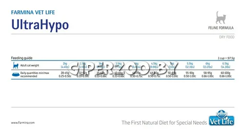 Farmina Vet Life Ultra Hypo содержит, в качестве единственного источника белка, гидролизат рыбы. Гидролизованные белки имеют низкий молекулярный вес (3.000 дальтон) и иммунная система не реагирует на них, что позволяет избежать сенсибилизации организма. Качество белка обеспечивается безопасным методом гидролиза, благодаря этому риск аллергических реакций сводится к минимуму. Для снижения аллергености в корме содержится рисовый крахмал в качестве единственного источника углеводов. Как источник жира в диете используется рыбий жир, содержащий оптимальное соотношение Омега-3 и Омега-6, которые обладают противовоспалительными свойствами и обеспечивают здоровье кожи и шерсти. Специально подобранное соотношение растворимой фракции клетчатки и пребиотиков обеспечивает высокую усвояемость корма.