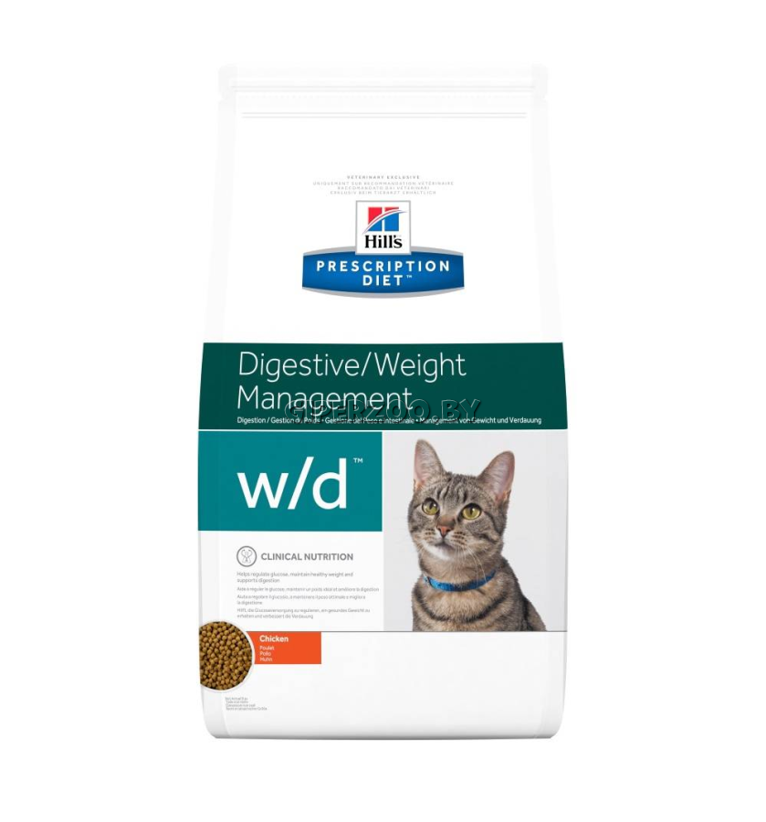 Hill’s Prescription Diet Feline w/d — сбалансированный корм для борьбы с лишним весом и поддержки правильной работы желудочно-кишечного тракта у кошки.