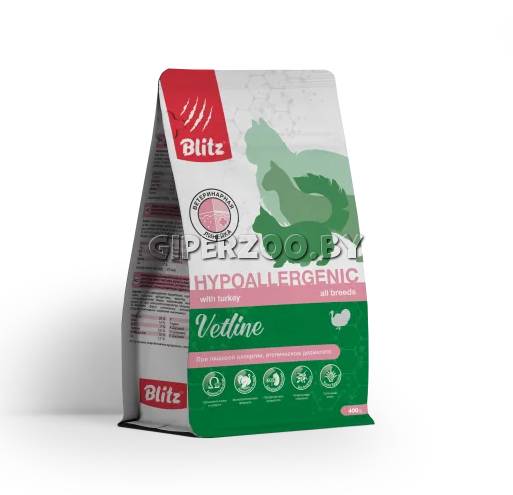 Blitz Cat Vetline Hypoallergenic (индейка), 400 гр - ветеринарной линейки для кошек направлен на уменьшение аллергических реакций и проявления атопического дерматита. При постоянном употреблении он помогает животным с покраснением кожи и зудом, слезоточивостью и воспалением ушных раковин быстрее прийти в норму. Кроме этого, питание носит профилактический характер при пищевой непереносимости кошек.