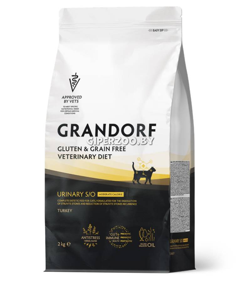 Формула на основе бескостной индейки. Стимулирует недонасыщение или метастабилизацию мочи при камнях струвитного типа и подкисление мочи. Благодаря низкому содержанию магния, способствует растворению струвитных камней и снижает риск их повторного образования. Умеренное содержание энергии и низкий процент жиров, помогает контролировать массу тела питомца.