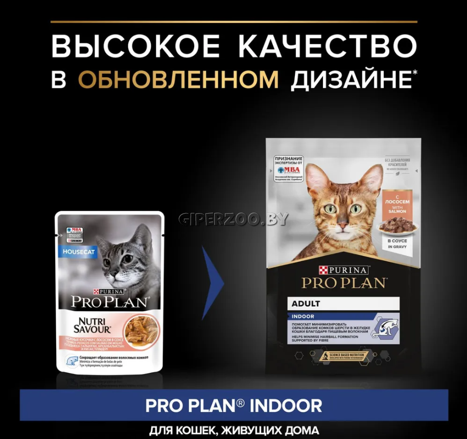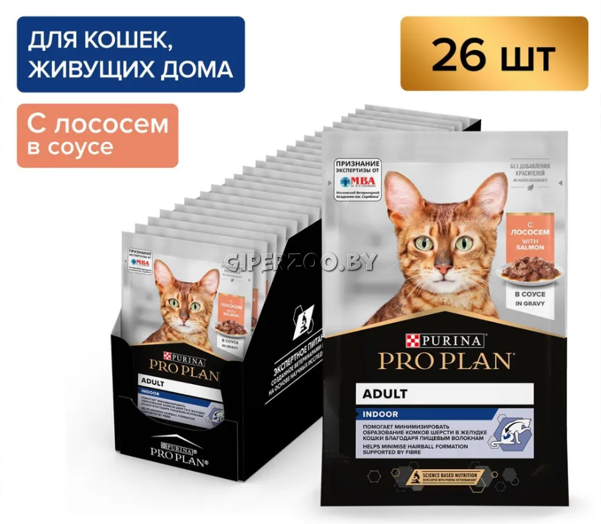 Влажный корм для кошек Pro Plan Adult Indoor с лососем в соусе – это специально разработанный корм для взрослых кошек, ведущих малоподвижный образ жизни в помещении. Этот корм помогает поддерживать оптимальный вес и здоровье вашего питомца благодаря сбалансированному содержанию питательных веществ.