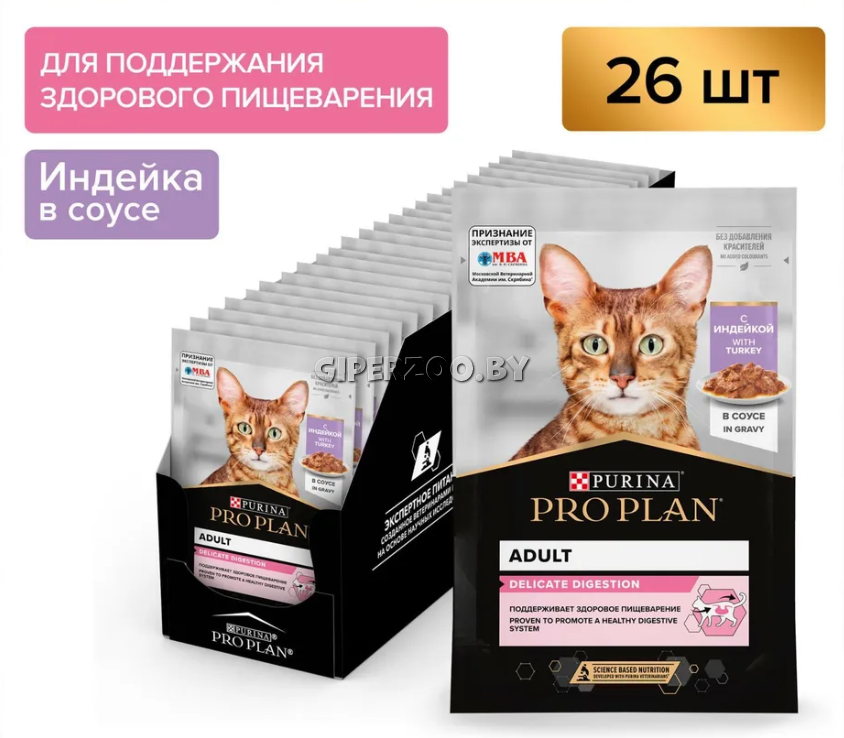 Влажный корм для кошек Pro Plan Adult Индейка в Соусе — это специально разработанный корм для взрослых кошек, обеспечивающий поддержку здорового пищеварения и общего состояния здоровья.