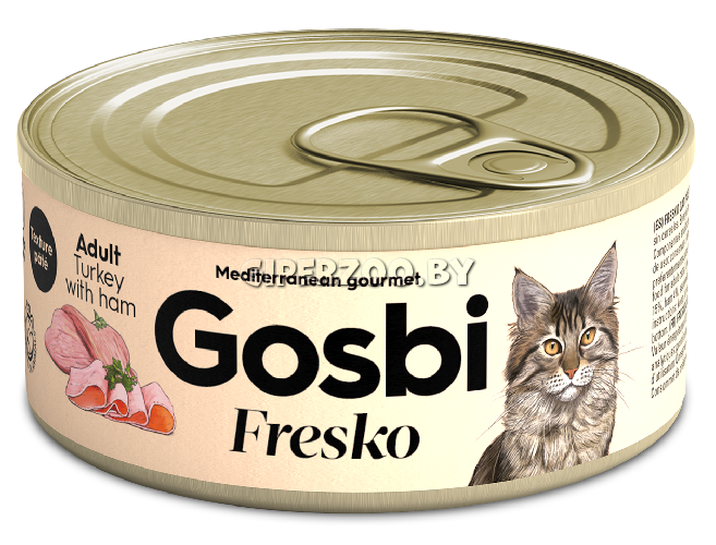 Gosbi Fresco Adult Turkey Ham - сбалансированный влажный корм в виде паштета с мясом индейки и ветчиной. Используется как дополнительное питание к ежедневному рациону животного.Влажный корм Gosbi Fresco позволяет кошкам насладиться вкусным натуральным питанием высочайшего качества, приготовленном в собственном соку. Превосходный аппетит Вашему питомцу гарантирован.Питание произведено из натуральных ингредиентов с высоким процентным содержанием высококачественного белка, без добавления консервантов, красителей, ароматизаторов и злаков.Консервы серии Gosbi Fresko приготовляются на фабрике по производству продуктов питания для людей. Состав: Мясо индейки 40%, куриное мясо 15%, ветчина 4%, морские водорослиПитательные вещества: Белок: 10%, сырая клетчатка: 0,1%, жиры: 7.2%, сырая зола: 2.2%, влажность: 76%