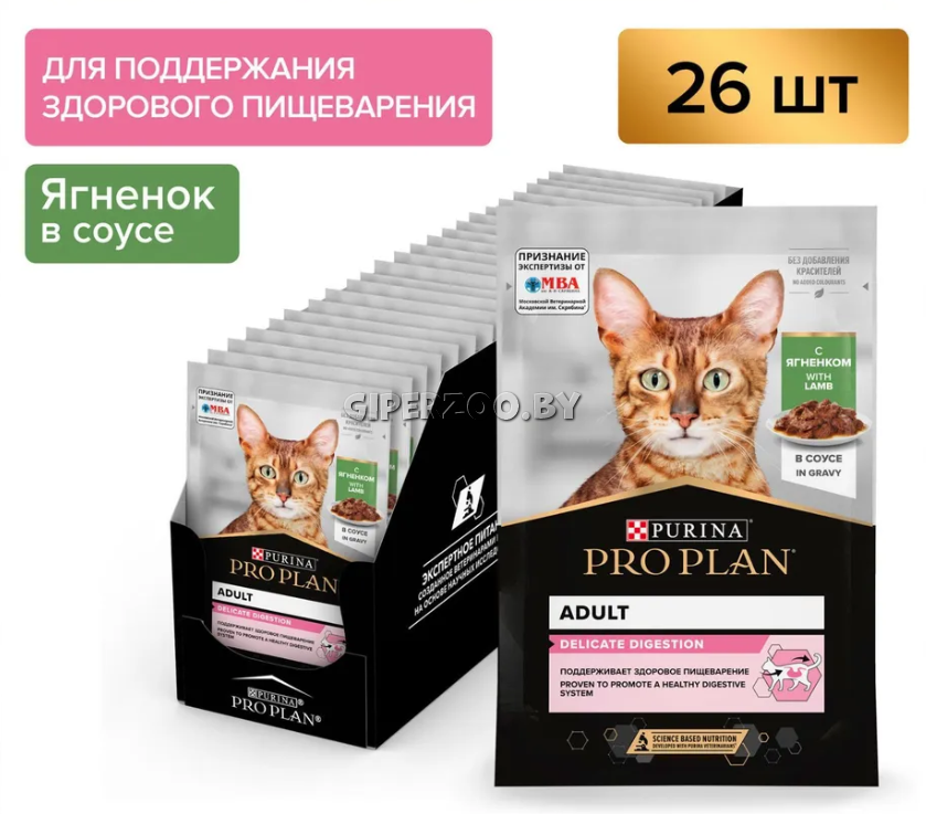 Влажный корм Pro Plan Delicate Digestion для кошек с чувствительным пищеварением. Нежные кусочки с ягнёнком в соусе. Хорошо усвояемые ингредиенты. Снижает риск возникновения кожных реакций, вызываемых непереносимостью к пище. Качественные ингредиенты способствуют тщательному перевариванию пищи.
