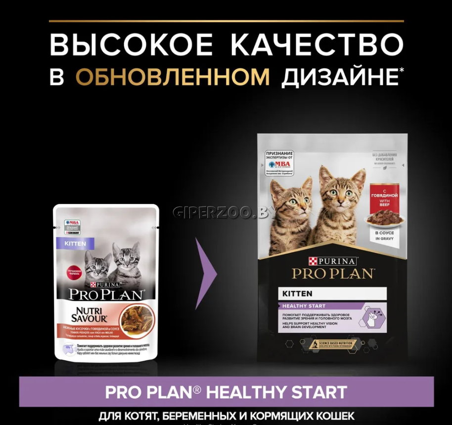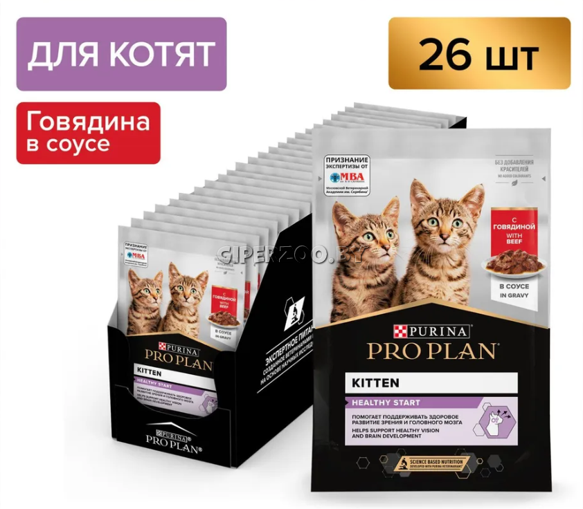 Влажный корм для котят Pro Plan Kitten Говядина в Соусе — это премиальный корм, специально разработанный для котят, обеспечивающий оптимальное питание для здорового роста и развития.