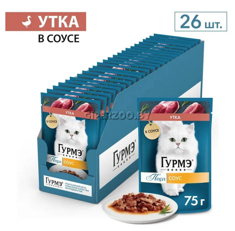 Gourmet Perle с уткой, 85 гр - мини-филе в соусе - это изысканное угощение с непревзойденным вкусом, которым Ваша кошка будет наслаждаться каждый день. Нежные кусочки с мясом или рыбой тщательно приготовлены в аппетитном соусе для удовлетворения утонченного вкуса Вашей кошки. Для взрослой кошки среднего веса (4 кг) требуется 3-4 пакетика в день. Кормление желательно разделить минимум на два приема.