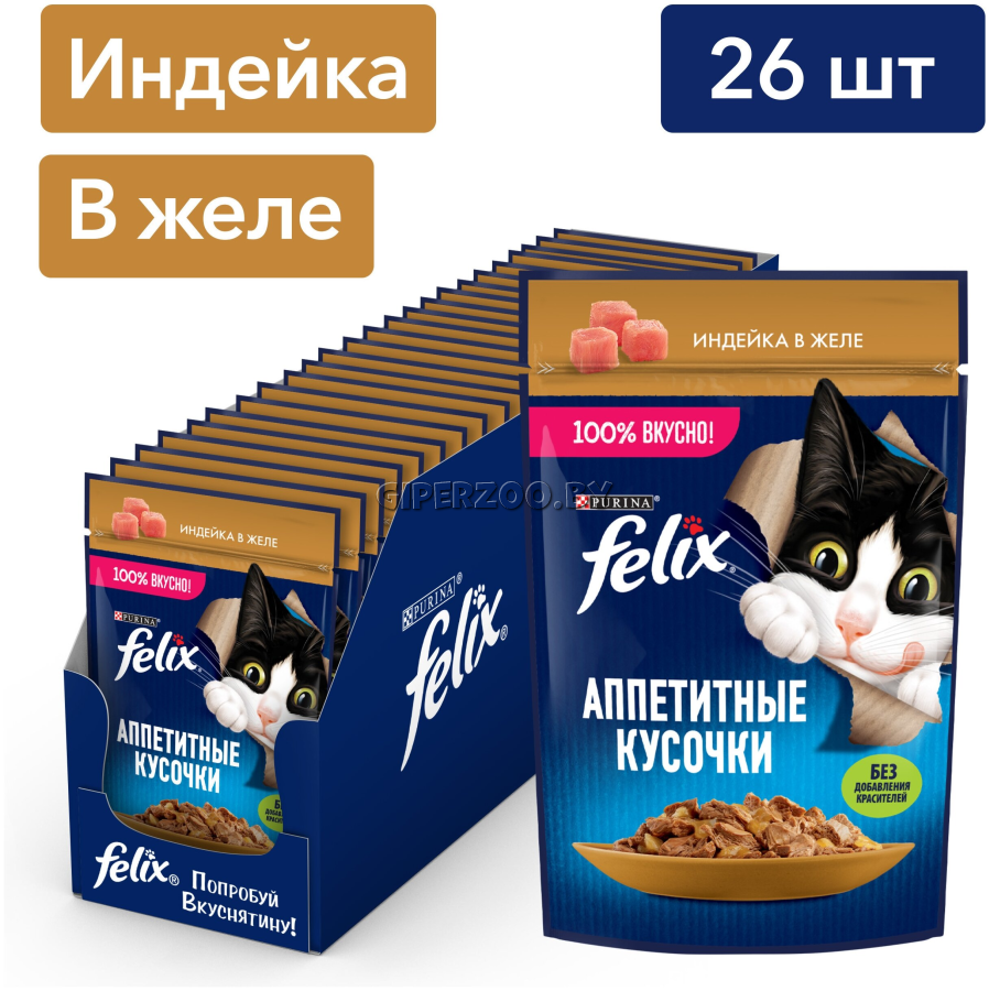 Felix Аппетитные кусочки для кошек (Индейка в желе), 75 гр*26 шт— это совершенно особенный корм для кошек. У него такой аппетитный вид и аромат, словно его приготовили Вы сами. Каждый пакетик содержит нежные кусочки в сочном желе — вкуснятину, от которой кота за уши не оттащишь.