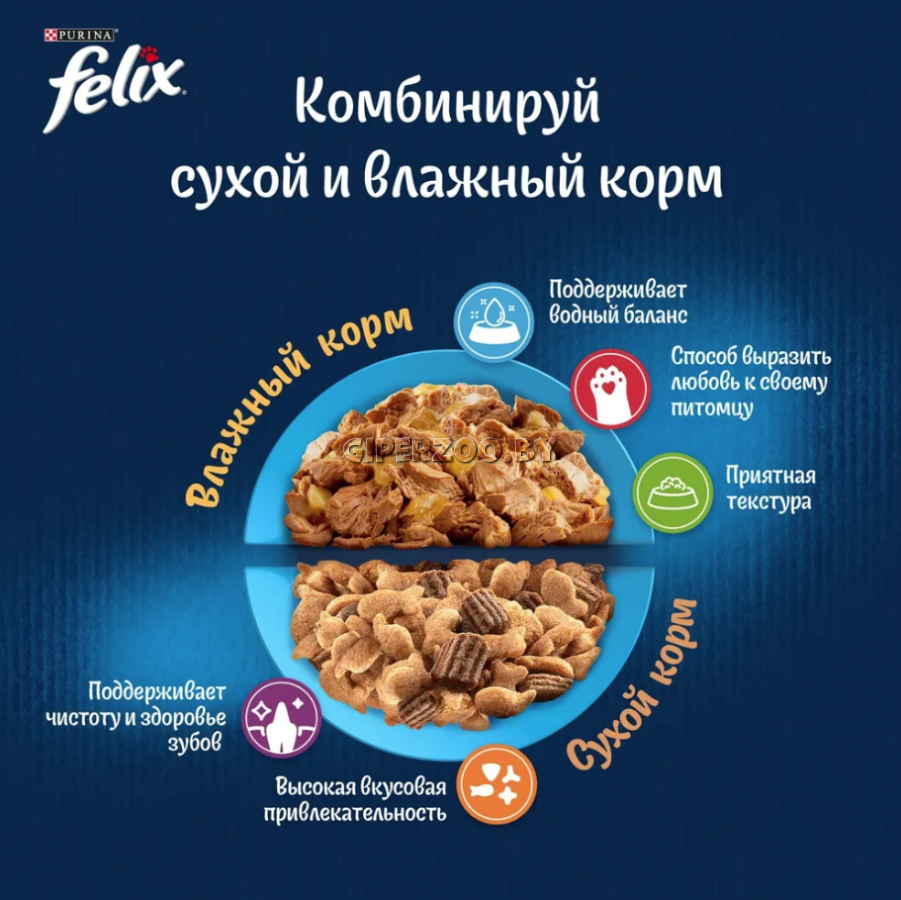 Влажный корм в пакетиках Феликс говядина в желе каждый пакетик содержит нежные кусочки в сочном желе — вкуснятину, от которой кота за уши не оттащишь.