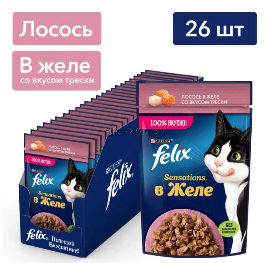 Консервы для кошек Felix Sensations для кошек (Лосось и треска в желе), 75 гр*26 шт ‒ консервированный полнорационный корм для взрослых кошек.