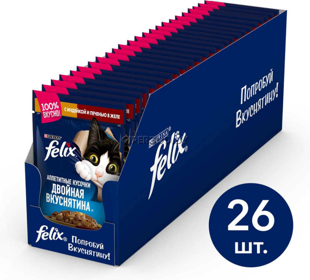 Консервы для кошек Felix Двойная вкуснятина для кошек (Индейка и печень в желе), 75 гр*26 шт— это невероятно вкусный корм для кошек. У него такой аппетитный вид и аромат, словно его приготовили Вы сами.