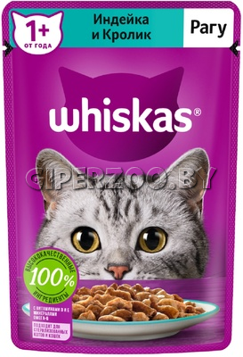 Это сбалансированный рацион, приготовленный так, как любит ваша кошка. Аппетитное рагу с индейкой и кроликом в густом соусе обязательно понравится вашей любимице. Жизнь замуррчательна, ведь Whiskas® содержит все необходимое, чтобы еда вашей кошки была не только вкусной, но и полезной. Whiskas® поддержит иммунитет, позаботится о здоровом пищеварении и здоровье кожи и шерсти вашей кошки. Подходит для стерилизованных котов и кошек.