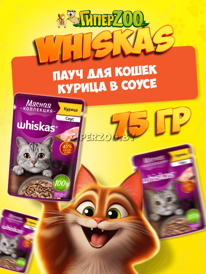 Влажный корм для кошек Whiskas Мясная коллекция (курица в соусе) - это палитра мясных блюд, которые обладают особой волокнистой текстурой. Порадуйте вашу кошку сочными кусочками с курицей и доставьте ей максимум удовольствия.